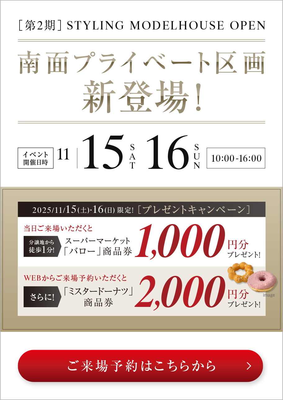 ※プレゼント数に限りがあるため、無くなり次第終了となります。予めご了承ください。※プレゼントは事前予約の上、モデtルハウスをご覧いただき、アンケートにお答えいただいた方、1家族1回限りとさせていただきます。また、未成年の方のみのグループ参加はご遠慮ください。